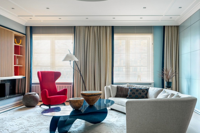 «Заказчики сразу сказали, что точно не хотят светло-бежевые оттенки, темные полы и вообще нейтральный, скучный интерьер, - рассказывает автор проекта. – Отправной точкой для нас стал любимый драгоценный камень заказчицы – сапфир со всем многообразием его оттенков: синими, голубыми, жемчужно-серыми. С основными холодными цветами контрастируют теплые оранжевые, красные и желтые акценты».