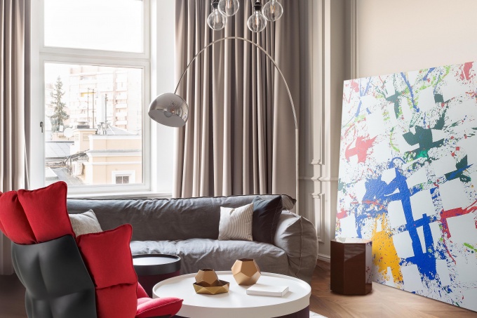 Заказчики дизайнера Елены Лушкиной и архитектора Татьяны Забелиной раньше жили на юге России и привыкли к теплой погоде, яркому солнцу и короткой зиме, поэтому московский климат с малым количеством солнечных дней в году доставлял им некоторые неудобства. Двухэтажную квартиру в новом монолитно-кирпичном доме они приобрели с четким пониманием, что хотят нетривиальный интерьер с цветной колористкой и авторскими предметами.