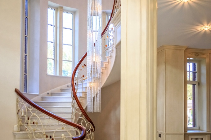 Для придания особого шарма помещению классический стиль в интерьере лестничных холлов предусматривает использование самых разных декоративных решений. Преображение конструкций из дерева, в том числе и ограждений, может выполняться посредством применения резьбы, браширования, позолоты. Напольное покрытие в помещении чаще всего мраморное.