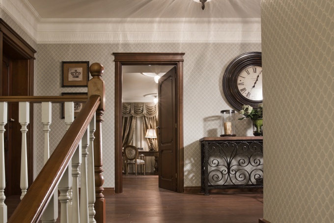 Холл в стиле Тюдоров массивен и величественен. Сам лестничный марш выполняется из ценных твердых пород дерева и покрывается темным лаком. Широкие перила и балясины выдерживаются в этом же цветовом решении. Чтобы эта конструкция не играла роли доминанты и визуально не перетягивала на себя все внимание, на стенах развешиваются картины, и делается дополнительная их подсветка. Такой лестничный холл в английском стиле придает всему дому дополнительное ощущение стабильности и основательности.