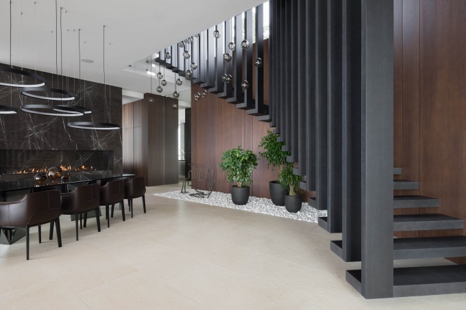 Функциональный комфорт и эстетика для него были одинаково важны. Хотелось чистого пространства, открытого и свободного с современными артефактами и предметами искусства. При этом, например, системы «умный дом» делать не следовало: в его предыдущем доме она была установлена и сильно усложняла жизнь. «Иногда людям хочется тактильности, им спокойнее включить и выключить свет самостоятельно, без помощи дистанционной системы», - отмечает архитектор проекта.