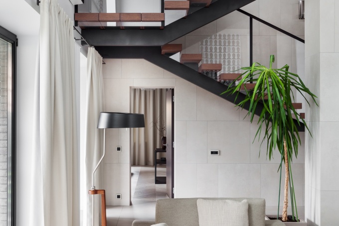 Оформленный дизайнерами Маргаритой Астафьевой и Татьяной Горошко двухэтажный дом находится под Санкт-Петербургом, в живописном поселке с налетом английского аристократизма «Ламбери». Однако несмотря на стилистику общей застройки заказчики не хотели традиционный классический особняк, им был нужен современный, отчасти даже минималистский дом: простой, понятный, светлый, с минимумом мебели и декоративных деталей.