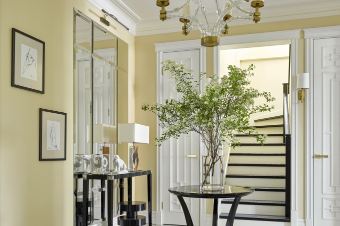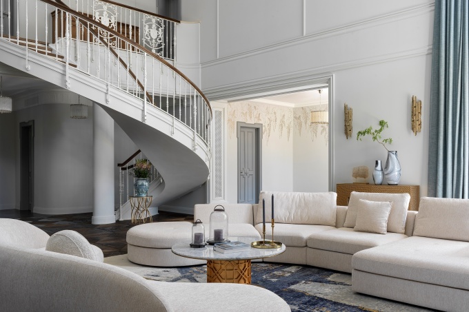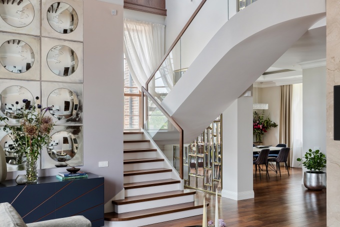 У этого семиуровневого таунхауса, расположенного в живописном подмосковном районе, интересная история. Около 10 лет назад дизайнер Юлия Маркос проектировала в нем интерьеры: помпезные, классические, с плотным декором. Не так давно дом сменил своего владельца, и для его оформления заказчики вновь пригласили Юлию. Только задачу поставили совсем другую – впустить свет и воздух, добавить французской легкости и шарма и создать парадный классический интерьер с современным декором и элементами ар-деко.