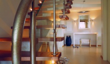 Несмотря на то, что стиль неоклассика в интерьере лестничных холлов не предусматривает обилия вычурного декора, вся красота и элегантность достигается за счет сочетания цвета, фактуры материалов и геометрических форм. Зачастую лестницы выполняются плавной извилистой формы, что позволяет не только экономить пространство, но и усложнить его для восприятия, тем самым сделать более интересным. К тому же изгибы перил при таком решении очень приятны для тактильного контакта. В отделке используются благородные натуральные материалы, чья текстура сама может стать украшением после полировки и покрытия лаком и не потребует дополнительной резьбы и инкрустации. Такими считаются дуб, бук, орех, светлый мрамор.