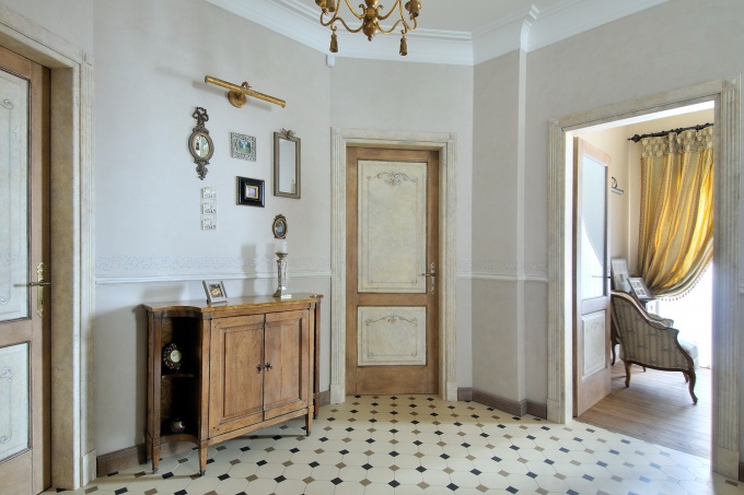 Мебель в таком пространстве бывает представлена консолями и кушетками с вычурной и одновременно сдержанной отделкой. Возможным оказывается также использование стульев с резными спинками. Все детали обстановки окрашиваются преимущественно в пастельные тона, благодаря чему они отлично вписываются в готовый интерьер.