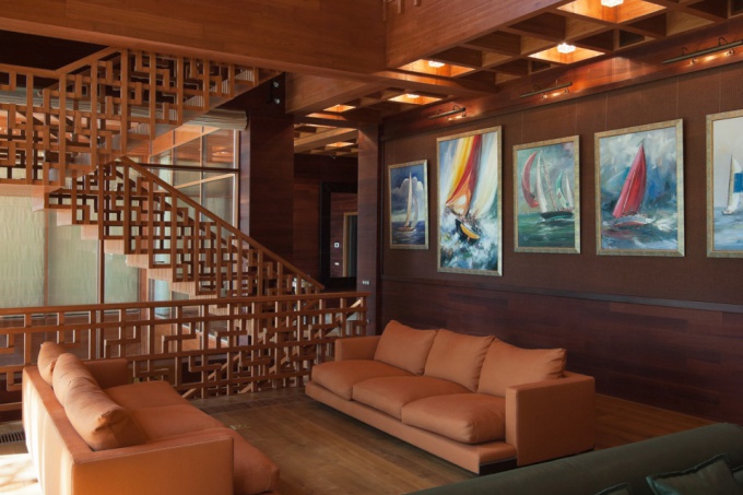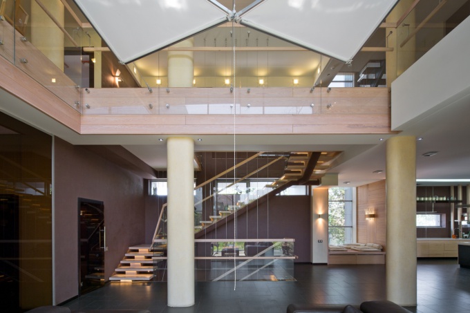 Конструктивные элементы дома выполнены из монолитного железобетона и клеёного соснового бруса. В целом, в проекте использована древесина трех пород: сосны, лиственницы и мореного дуба.