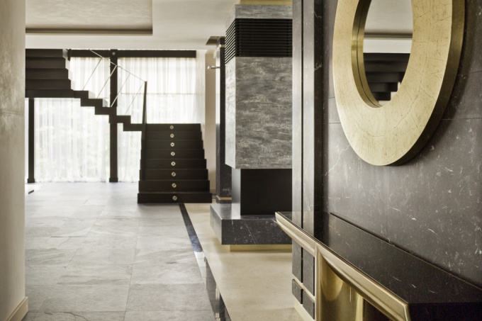 Единственное пожелание, которое четко было озвучено – современная стилистика, в остальном авторам пришлось действовать на свое усмотрение, руководствуясь особенностями местности, конструкцией дома с большим количеством несущих колонн и логикой зонирования для комфортного проживания на природе. В итоге был создан открытый на природный ландшафт современный дом с мотивами ар-деко и натуральными материалами с красивой фактурой: травертином, мрамором, сланцем.