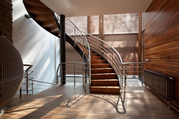 На проект этого дома и его декоративное решение архитектора Максима Кашина вдохновил интерьер церкви в Вольфсбурге, спроектированной финским архитектором-модернистом Алваром Аалто в 1963 году. Строгая геометрия, использование реечного декора, аскетизм и спокойствие стали визитной карточкой современного двухэтажного особняка, спроектированного для большой семьи.