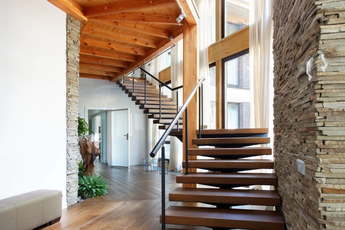 Над проектом дома работала архитектор Елена Волгина (АБ "Шаболовка"). Использование текстуры природного сланца и древесины бирманского тика во внутренней отделке позволили ей поддержать образ дома с эко-темой.