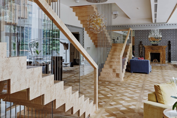 Сложный рисунок выкладывали по месту, чтобы не только правильно обрамить все углы и проемы, но и задать фасадам интересный ритм, в котором читаются палладианские традиции. Для разработки интерьеров были приглашены архитекторы Мария и Никита Бахаревы, которые развили тему деревянного зодчества и превратили дом в эпатажное пространство для произведений искусства.