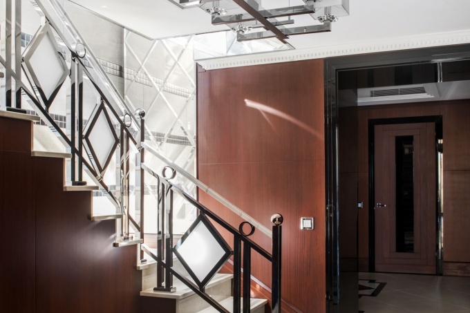 Благодаря тому, что работа над проектом дома шла параллельно с разработкой дизайн-проекта интерьеров, удалось учесть все пожелания заказчика по планировке и расположению помещений, а также по инженерным решениям: монтажом систем климат-контроля, аудио и видео-оснащением и прочими техническими особенностями, которые ассоциируются с премиальным загородным жильем. Главной задачей внутреннего оформления стало создание пространства, которое служит продолжением природного окружения. Отсюда и высокие витражные окна, и сквозная планировка, дающая солнечному свету свободно проникать в помещения, и теплая палитра. Не случайно выбрана и стилистка ар-деко: она помогает подчеркнуть статус заказчика и особое отношение к жизни.