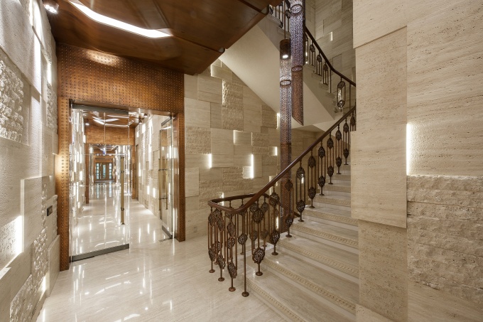 К работе над проектом архитекторы Сергей Эстрин и Владимир Пасынков подключились, когда дом уже был построен: гостевое здание площадью 2760 кв. м возводилось поэтапно, сначала появился одноэтажный объем с теннисным кортом, потом к нему был пристроен бассейн, затем возведены два жилых этажа, начались отделочные работы…