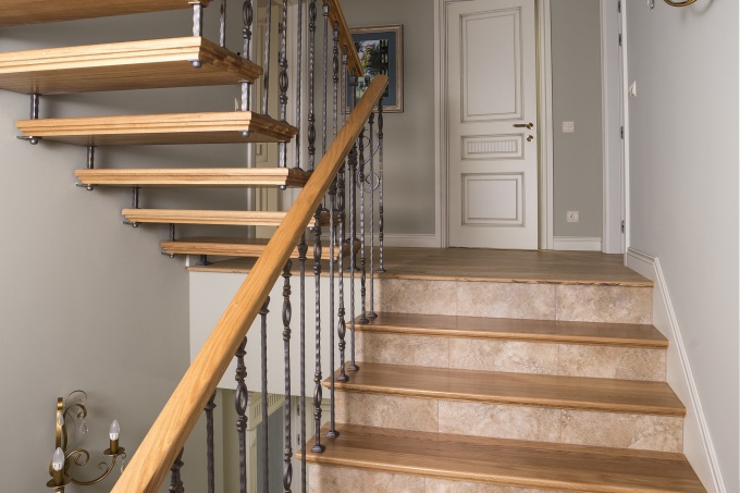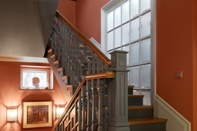 Стилизация лестницы поможет удачно подчеркнуть и один из выбранных дизайнером интерьерных решений, например, таких как имитация средневекового замка или добротной русской обители сибирского первопроходца. Здесь применяются любые природные материалы, из которых наиболее уместным является дерево. Иногда ступени ограждения создаются из состаренной искусственным образом керамической плитки.