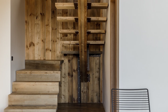 Деревянный дом площадью 310 кв. метров расположен в коттеджном поселке в Подмосковье. Застройщик планировал сдавать дом с отделкой, и, когда дизайнеры подключились к проекту, была частично выполнена электрика и заложены некоторые архитектурные решения. Часть из них авторы проекта предложили скорректировать, создав максимально удобный план дома. Чтобы сделать конструктивные изменения незаметными, заново воздвигнутые стены были отделаны имитацией бруса.