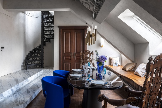 Двухэтажный пентхаус расположен на верхних этажах особняка и служит квинтэссенцией авторского подхода к работе с историческим наследием Санкт-Петербурга. Его яркую стилистику сами архитекторы называют «новая эклектика», в основе которой гармоничный сплав традиций и модернизма. «Это абсолютно авторский, стопроцентно персонализированный под заказчика интерьер, в котором каждый элемент индивидуально прорисован и создан вручную лучшими современными мастерами», - рассказывают авторы проекта.