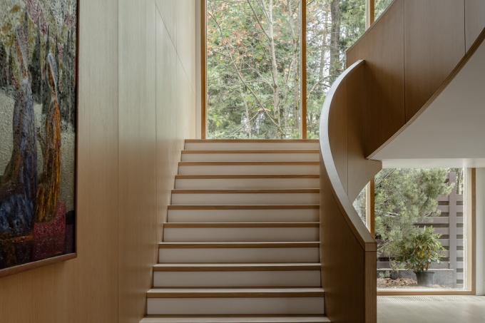 К дому пристроена просторная терраса с большим камином и обеденным столом на десять персон. На участке также спроектирован двухэтажный СПА-комплекс с бассейном и всесезонная теплица, где семья выращивает овощи и зелень, воплощая концепцию farm to table. Это настоящая современная усадьба, где интерьер, архитектура и ландшафт тесно связаны друг с другом.