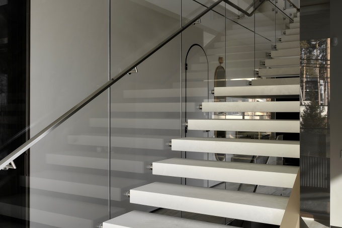К работе над проектом дизайнеры подключились на стадии бетонной «коробки». В ходе обследования здания были обнаружены ошибки в проектировании лестницы и террасы второго этажа, а также существенные недостатки в планировочном решении. Они скорректировали недочеты и воплотили оптимальные инженерные решения: отопление, систему вентиляции, умный дом.