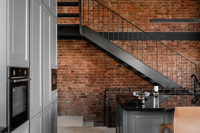 Темный кирпичный фасад, большие внутренние объемы, высокие окна и потолки и другие характерные элементы фабричной эстетики вдохновили на создание очень подробного фактурного интерьера, стилистику которого сами авторы определяют как городской фьюжн. Интерьер получился живым, с обволакивающей атмосферой и тактильными поверхностями, главное в нем – красота природных фактур и мастерское соединение брутализма и мягкости.