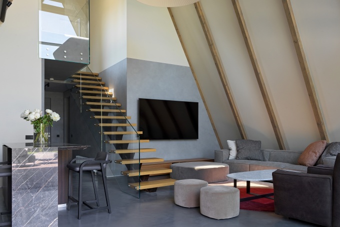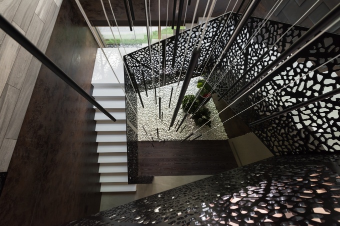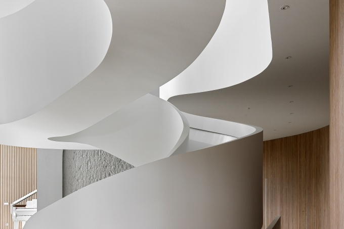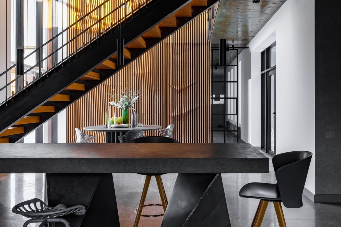 «Угловатый и несуразный исходник мы постарались кардинально переосмыслить и максимально уйти от ассоциаций с окружением. Угловатость заменили плавностью, незавершенность – законченностью, пренебрежение к деталям – педантичностью. А очевидно избыточный и абсолютно нефункциональный второй свет решили использовать с размахом, заняв его центр плавной, извивающейся монолитной лестницей», - рассказывает архитектор Сергей Колчин. Эта лестница в пустоте и стала визиткой проекта.