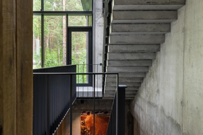 Сам автор проект называет «Левитация», поскольку второй этаж, где расположена спальня, выходит за границу нижнего на целых 20 метров. Тонкие сваи, на которые он опирается, теряются на фоне природного соснового леса, отчего возникает эффект парения. Его усиливают зеркальные панели, которыми облицован фасад над нижним объемом, и большие витражи. Прием с консольным этажом, приподнятым на 12 метров, позволил не только вписать постройку в сложный рельеф, сохранить оптимальную для восприятия высотность, но и освободить участок для сада и прогулок. Нестандартная архитектура, строгая геометрия, разумная планировка, обилие панорамных окон (иначе зачем жить на природе?) – в проекте архитектор реализовал свое представление о современной и комфортной жизни в окружении природы.