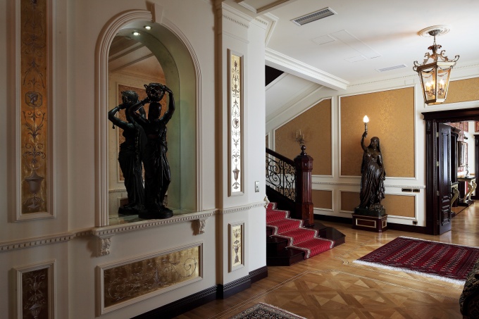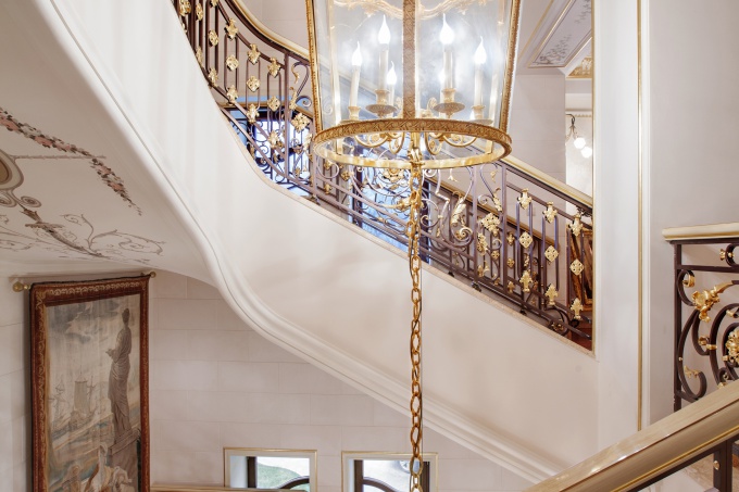 Дизайнер Ольга Кушнарева-Леоне (руководитель архитектурного бюро Olga Kushnareva-Leone Architecture&Design) разработала и реализовала масштабный декораторский проект оформления четырехэтажного особняка в Подмосковье. Поиск декоративного образа резиденции площадью 7000 кв. метров и разработка дизайн-проекта заняли больше года, практически столько же времени ушло на монтажные и отделочные работы.