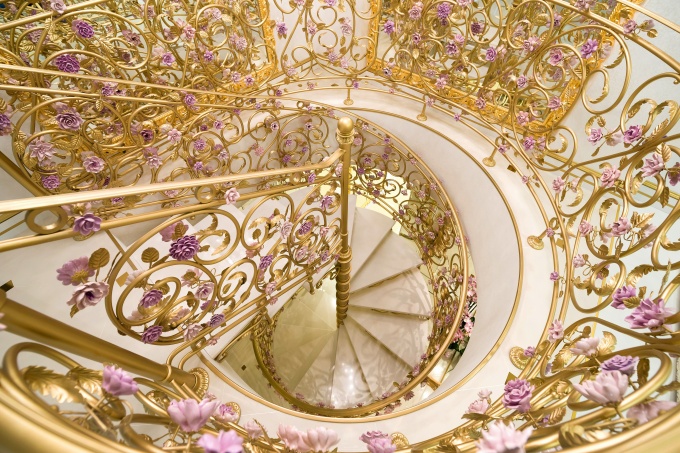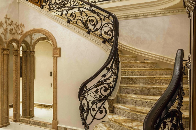Лестница, выполненная в дворцовом стиле, характеризуется роскошью, элегантностью и богатством декора. Она требует особого простора вокруг себя, да и сама должна быть обустроена с размахом. Такой интерьерный элемент выполняется из мрамора, гранита, ценных пород дерева. Приветствуется использование кованных и резных деталей ручной работы. Неповторимый дизайн лестниц в дворцовом стиле привлекает внимание, модели поражают архитектурной выразительностью, величием форм, безупречной отделкой. Конструкции выглядят торжественно, ведь каждая линия и форма здесь пропорционально выверена. Как правило, такие лестницы имеют массивные ступени, резные перила и фигурные балясины. Резное оформление и использование декоративных элементов, покрытых золотом, придает моделям особый шарм. Оригинальные конструкции выгодно оттеняют шикарные интерьеры, выдержанные в соответствующей стилистике. Представленные в данном разделе фото лестниц в дворцовом стиле еще раз доказывают, что такие конструкции являются не просто функциональными элементами дома, но и истинными произведениями интерьерного искусства.