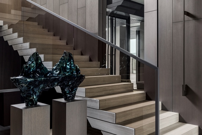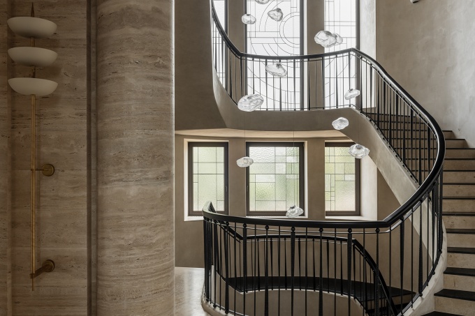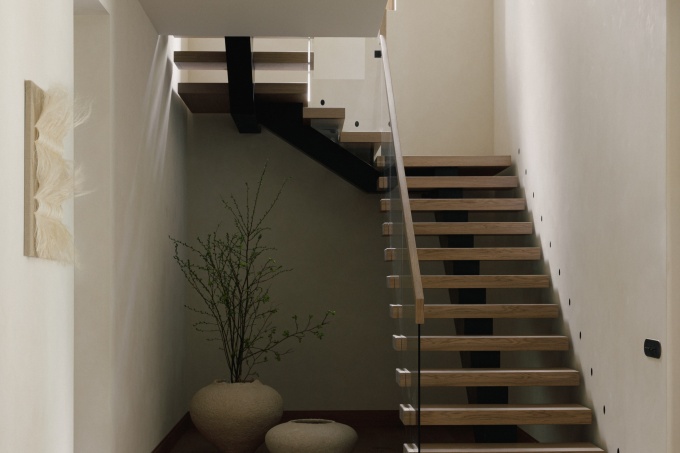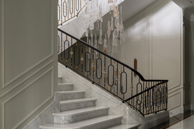 «Я не присутствовала на первой встрече, мне передали только запись разговора, - рассказывает архитектор. – В ней заказчица озвучила основные пожелания: связь интерьера с экстерьером, индивидуальная вневременная стилистка с отсылками к ар-деко, авторские, но без экстравагантности решения, нейтральная цветовая палитра с нюансной деталировкой и каменный пол в помещениях первого этажа. Сначала меня смущал камень, так как почти любой мрамор имеет активный рисунок и берет на себя много внимания. Но мне удалось найти идеальный вариант – юрский мрамор, у него абсолютно нейтральный цвет и сложная текстура с включением окаменелостей». В итоге именно камень задал основную линию: мягкие бежево-песочные оттенки и тактильные фактуры объединили весь интерьер. Благодаря такому решению все 1300 кв. м воспринимаются как единое цельное пространство, очень комфортное для проживания. Нейтральный цвет хорошо подчеркивает архитектуру и пластику стен и оттеняет цветовые акценты, раритетный винтаж и искусство.
