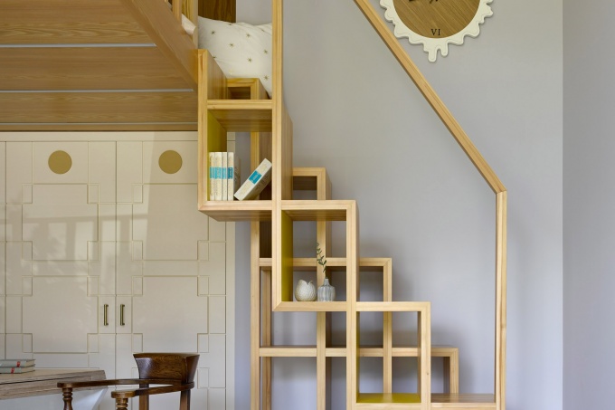 Тему оформления во многом диктовала сама архитектура дома: двухскатная кровля, высокий второй этаж, ограждения балконом, импосты окон. Архитекторы предложили увеличить площадь верхнего уровня, надстроить антресоль, для чего разобрали внутреннюю обшивку и обнаружили замечательные гнутые балки бионической формы.