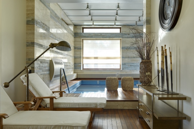 Отчего постройка площадью 650 кв. метров выглядит куда больше и просторнее, чем есть на самом деле: большие высоты, ассиметричные объемы, перетекающие пространства наполняют его воздухом и светом. Непосредственной декораторской работе предшествовало осмысление столь не простого пространства. Ключом к нему стали масштабные детали, ритмическое чередование вертикалей и горизонталей, эффектные декоративные полоски, набранные из разных материалов.