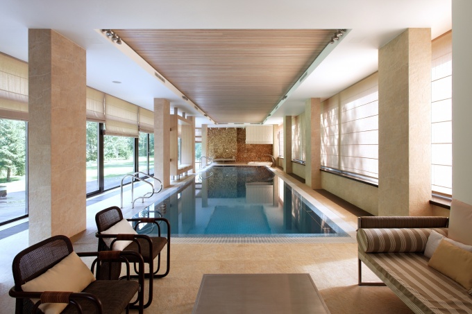 Природный камень с разнообразной фактурой и дерево стали лейтмотивом проекта и связали экстерьер с интерьером, а само здание с нерукотворным подмосковным пейзажем. Вытянутый по форме дом составлен из двух прямоугольных блоков, соединенных открытой террасой в виде полукруглого подиума. В центральном, большом, объеме расположены все жилые помещения, в примыкающем к нему под широким углом флигеле – домашний SPA-комплекс. Облицовка фасадов камнем и деревом создает ощущение органичной связи архитектуры и ландшафта, дом словно вырастает на опушке соснового леса.