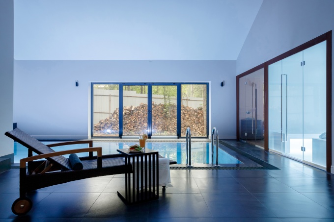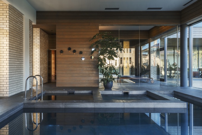Поскольку следовало учитывать рельеф местности и максимально сохранить существующую растительность, главным принципом работы архитекторов было «не навреди». Так возникла сложная композиция из четырех основных домов: хозяйского, гостевого, спа-комплекса и павильона охраны, которые связаны между собой кровлями, мостами и переходами. Здания возведены из клееного бруса, в отделке фасадов использованы панели из цинк-титана и меди.