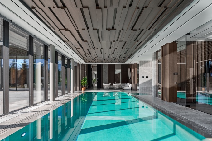Но стандартных 570 кв. м им оказалось чрезвычайно мало, поэтому они пригласили Елену для расширения площади и эффектного дизайна внутреннего пространства. В итоге за несколько лет дом увеличился практически в три раза: появилась пристройка СПА-комплекса с плавательным бассейном и жилым блоком персонала с отдельным входом, веранда с раздвижными окнами и 100 кв. м террас. Благодаря тому, что участок 25 соток примыкает к лесу и имеет только одного смежного соседа, удалось правильно организовать видовые пространства, зонировать приватные зоны и сделать собственный выход в лес. При модернизации исходного проекта были добавлены современные системы кондиционирования, отопления, очищения воды, охраны и мультирум. В итоге получился по-настоящему комфортный, экологичный и надежный дом для большой семьи.