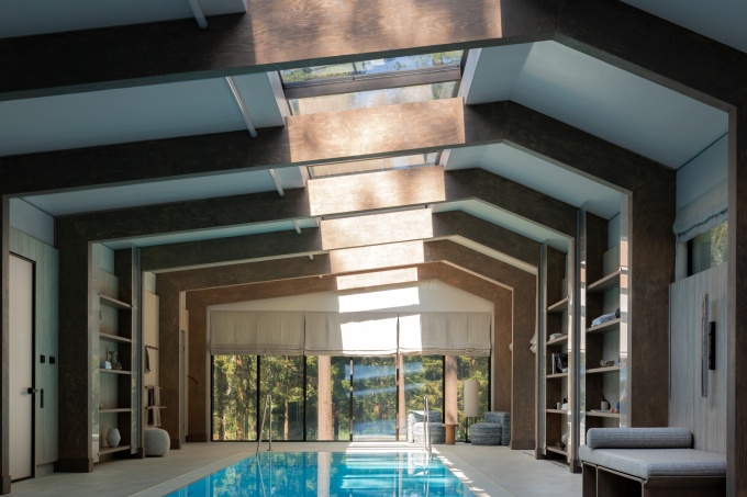 К дому пристроена просторная терраса с большим камином и обеденным столом на десять персон. На участке также спроектирован двухэтажный СПА-комплекс с бассейном и всесезонная теплица, где семья выращивает овощи и зелень, воплощая концепцию farm to table. Это настоящая современная усадьба, где интерьер, архитектура и ландшафт тесно связаны друг с другом.