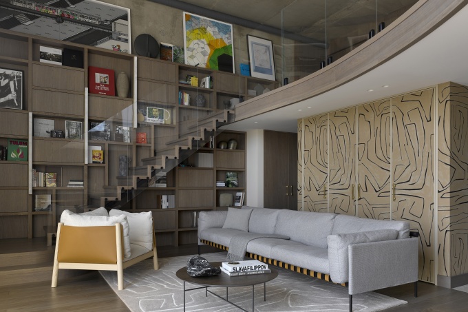 Дизайнер Алексей Стрелюк создал эклектичный интерьер, который стал эффектным обрамлением природного пейзажа за окнами. Именно из-за прекрасного вида, близости леса и набережной заказчики и купили эту квартиру, расположенную в жилом комплексе «Рублево». Взрослая семейная пара постоянно проживает в другой стране, квартира в Москве им была нужна для временных остановок, передышек и отдыха.