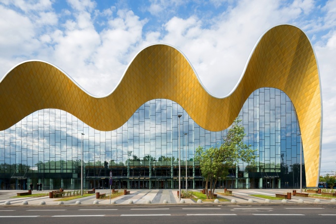При яркой образности и оригинальных фасадах, которые выглядят интересно с любого ракурса, здание представляет собой в первую очередь сложнейший инженерно-технический объект. Самый выразительный элемент здания – кровля стала и одним из самых сложных для архитектурного воплощения. Криволинейная форма потребовала не только поиска оптимальной геометрии силуэта, но и соответствующих материалов. Металл помог создать чистую выразительную форму поверхности кровли и достичь объемной, эффектной золотой ленты фриза, переливающейся на солнце. На кровле – уникальный кровельный пирог, разработанный специально для сложных кровельных поверхностей, с финишным покрытием из алюминиевого листа с фальцевым швом. Для создания поверхности кровли с двойным радиусом кривизны применялись листы облицовки различные по форме и длине: прямые, конусные, трапецивидные, радиусные. Внешнего блеска ленте (как одного из самых эффектных элементов фасада) добавляет цвет панелей облицовки треугольной формы из анодированного алюминия: десяток оттенков золотого! Сам объем – предельно лаконичный: простой параллелепипед, форма которого позволила разместить все необходимые функции на компактном участке.