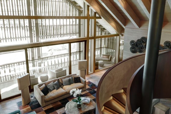 Стилистически заказчик хотел шале, но не привычное традиционное с нижним каменным этажом, верхним деревянным и скатной кровлей с большими свесами, а яркое и необычное: модернистское, с выразительной архитектурой. И архитекторы нашли нетривиальное решение – полувеером развернутый на внутренний сад дом с парящей кровлей, которая напоминает оригами и придает постройке динамику и дополнительную образность.