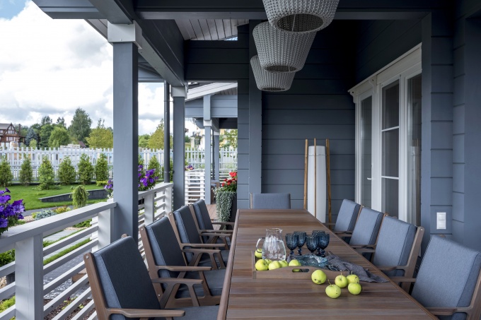 «С архитектурой и строительным материалом заказчики определились сразу, - рассказывает автор проекта. – Моя задача состояла в том, чтобы скорректировать проект, адаптировать его под образ жизни хозяев, оформить фасады и интерьеры. Расположение дома вдохновило на использование темы воды: основу составляют спокойная песочная палитра, а акцентами служат сложные оттенки голубого, зеленого, бирюзового. Необычный серо-голубой фасад дома – также отражение общей природной концепции». Кроме строительства основного дома в задачи дизайнера также входило проектирование ландшафта, расположение дорожек, цветников и постройка банного комплекса.