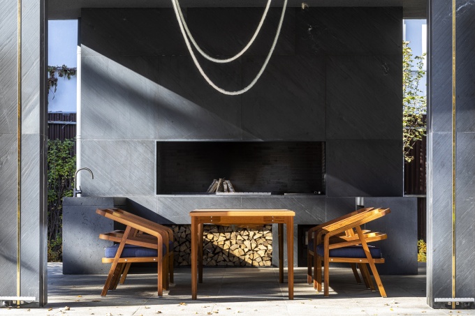 Двухэтажный дом с пристройкой СПА представляет собой монолитную постройку, с заполнением каркаса полнотелым кирпичом. В качестве несущей конструкции кровли-оригами использован LVL-брус. Снаружи и внутри подшивы выполнены из натуральной тонированной лиственницы. Чтобы организовать водосток, ендовы кровли были спроектированы с уклоном, что еще больше усложнило ее конструкцию. Для отделки фасада использованы слэбы из натурального доломита и сланца, распиленные в соответствии с раскладкой и уложенные с чередованием светлых и темных фрагментов. Окна, уходящие под кровлю, завершают облик дома и максимально открывают интерьер на ландшафт.
