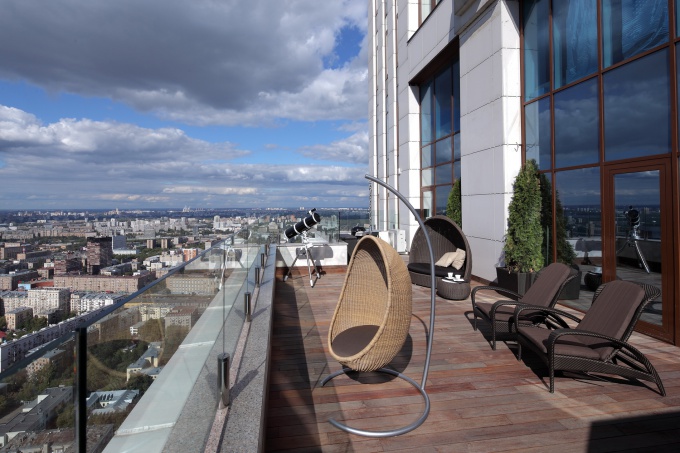 Одна из главных особенностей квартиры, расположенной на 45 этаже жилого комплекса «Триумф Палас», - роскошная терраса, откуда открывается впечатляющий вид на город.