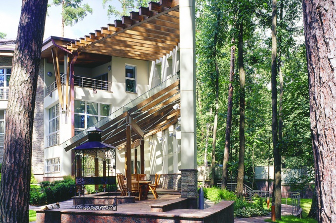 Это позволило сделать композицию дома с угловым выступающим элементом, выходящим на оба фасада. Здание облицовано белым финским кирпичом и натуральным деревом. Дом выглядит компактным: при общей площади дома в 360 кв. м площадь застройки составляет 191 кв. м. Облик дома формируют две открытые террасы (одну на крыше, другую – с выходом в сад из гостиной), а участка – теннисная площадка под навесом и беседка.