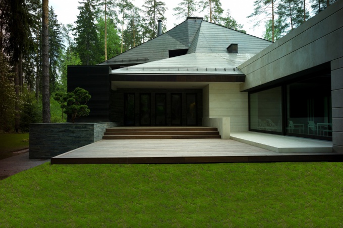 При проектировании дома архитекторы архитектурного бюро za bor исходили из сложной конфигурации ландшафта. Для строительства дома был отведен участок, который располагался на двух уровнях с перепадом в 3,5 метра.