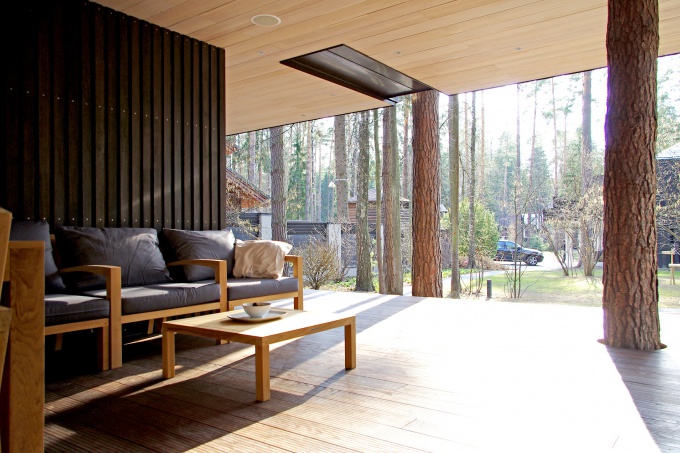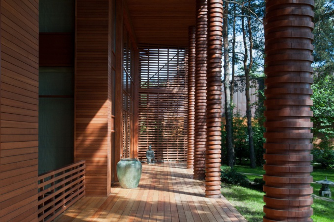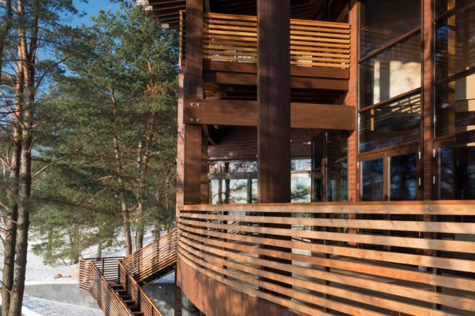 Дом развернут к водохранилищу южным фасадом, благодаря чему открывается прекрасная панорама на живописный пейзаж. Ощущение ориентированности на природу усиливает панорамное остекление первых этажей. Снаружи дом отделан шпунтованной доской из красного дерева разной ширины и плотности. Южный фасад обрамлен рядом рустованных колонн из дерева, они поддерживают навес второго этажа. С торцов деревянные рейки выглядят как ширмы, которые хорошо пропускают естественный и искусственный свет.