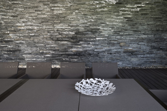На верхней был размещен открытый бассейн и веранда с летней кухней, на средней – гостевые апартаменты с мини-бассейном, а на самой нижней – ландшафтный парк и виноградник. Трехэтажный главный дом спроектирован так, что выглядит продолжением скальной породы: с одной стороны, он защищен от ветров, дующих в зимнее время, а с другой – максимально открыт на живописный пейзаж. Постройка возведена из гранита – аутентичного для данных мест материала, выход к бассейну накрыт перголой с вьющимися растениями.