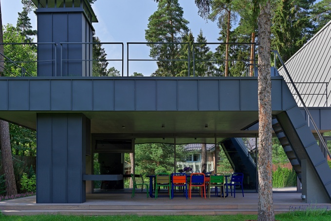 Функциональную архитектуру с разбивкой на лаконичные объемы поддерживает ритмичная отделка фасадов фоновой серой штукатуркой, черным кирпичом и листами из кортеновской стали. «Хотелось добавить яркости, живости, и коричнево-рыжий оттенок стали служит как раз таким акцентом. Вообще у нас получился дом в оттенках окружающей природы: штукатурка цвета питерского неба, темный, «земляной» кирпич и рыжий кортен, перекликающийся с цветом стволов высоченных сосен, растущих на участке», - комментирует архитектор.