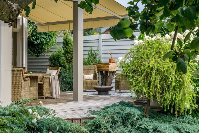 Кованые перила, настенные украшения, цветочные кашпо и старинные часы отличают прованский стиль частной террасы от других вариантов декорирования. Беседка в виде правильного многоугольника часто возводится в одном из живописных уголков сада, соединяясь с особняком аллеей во французских традициях.