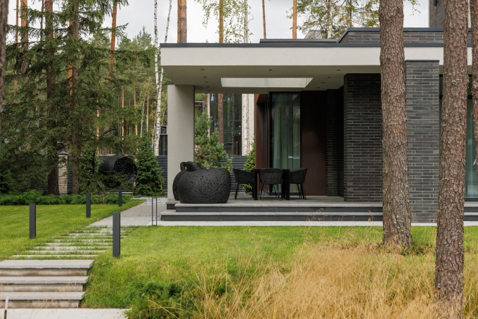 Задача перед ними стояла не просто разработать эргономичный и лаконичный проект с натуральными фактурами и сдержанной палитрой, но сделать это в кратчайшие сроки – за два месяца. Параллельно с реализацией интерьерных решений, они занимались проектом ландшафта. Дом расположен на лесном участке с большими перепадами высот – около трех метров. Чтобы подчеркнуть эту особенность и сохранить большие деревья (сосны и березы), они сделали удобное зонирование и оформили ступени и дорожки подсветкой.