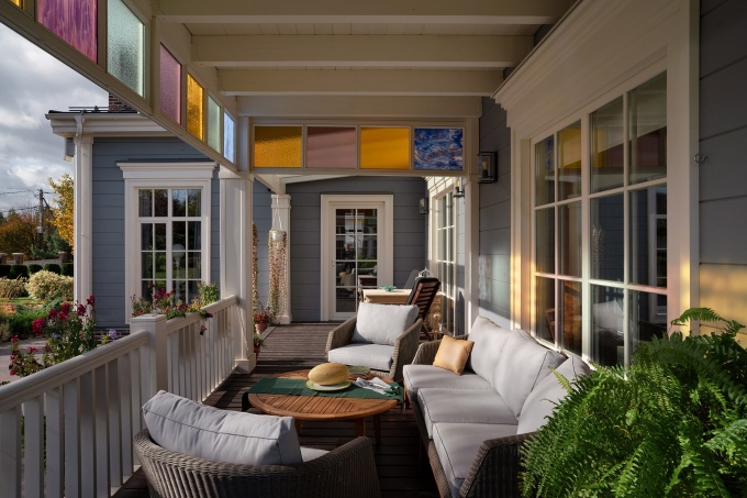 Для обустройства частного особняка проектируют дизайн веранд и террас с учетом особенностей использования помещения. Если зимой комната будет превращаться в зону отдыха или столовую – устанавливают окна с двойным утепленным профилем. В качестве основного источника света часто используются настенные ретро фонари со стальной окантовкой.