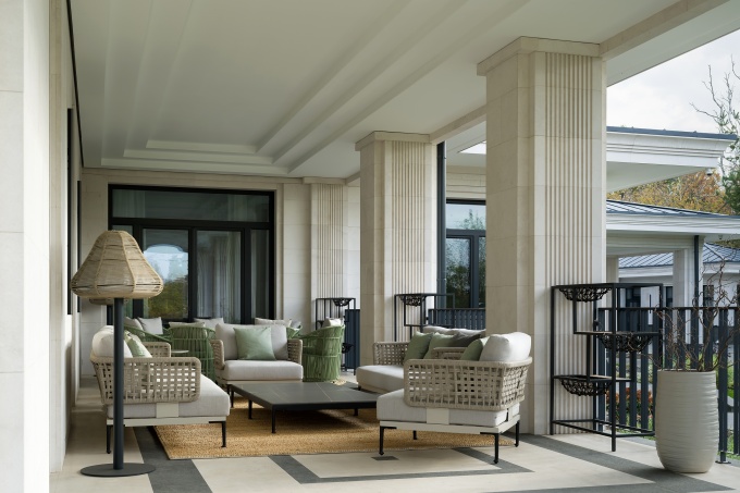 К дому пристроена просторная терраса с большим камином и обеденным столом на десять персон. На участке также спроектирован двухэтажный СПА-комплекс с бассейном и всесезонная теплица, где семья выращивает овощи и зелень, воплощая концепцию farm to table. Это настоящая современная усадьба, где интерьер, архитектура и ландшафт тесно связаны друг с другом.