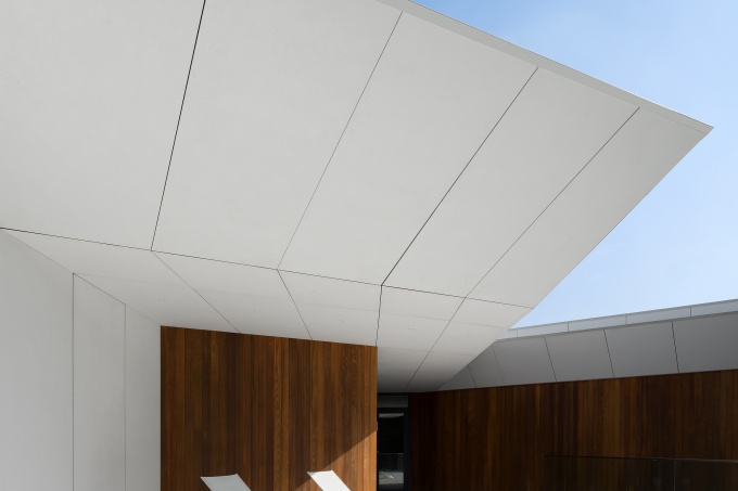Первый этаж визуально проницаем и открыт, в отделке фасада используются стекло и сатинированная нержавеющая сталь, позволяющие растворить его в окружающем ландшафте и наполнить отраженным светом сад.