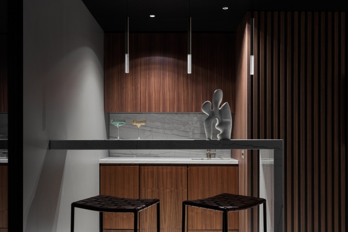 Ее бесспорное преимущество – панорамные окна с видом на стеклянные высотки «Москва-Сити». Чтобы максимально открыть интерьер на впечатляющую городскую панораму, авторы проекта спроектировали светлый, просторный и полный воздуха объем. Винная зона с баром, лаунджем и винным шкафом у окна – отдельное пожелание заказчиков.